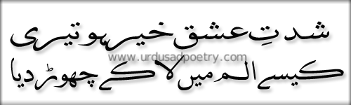 Shiddat-e-ishq khair ho teri – 2 line Urdu Poetry by Editorial Staff · Published June 25, 2012 · Updated November 8, 2024 Shiddat-e-ishq khair ho teri..! Kese alam me la kar Chor diya..! Share
