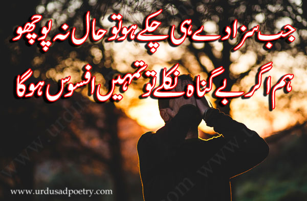 Jub Saza Dey Hi Chukey Ho Tu by Editorial Staff · Published April 27, 2018 · Updated November 7, 2024 Jub saza dey hi chukey ho tu haal na poocho Hum agar be gunah niklay tu tumhain afsoos hoga Share
