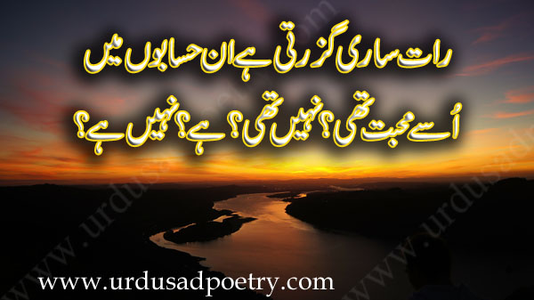 Sari Raat Guzarti Hay In Hisaboon Main by Editorial Staff · Published May 31, 2018 · Updated November 7, 2024 Sari raat guzarti hay in hisaboon main Usay muhabbat thi?nahi thi?hay?nahi hay? Share
