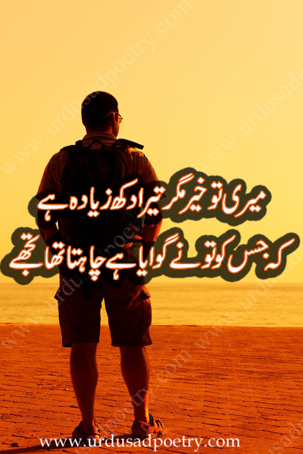 Meri To Khair Magar Tera Dukh Ziyada Hay by Editorial Staff · Published June 22, 2018 · Updated November 7, 2024 Meri to khair magar tera dukh ziyada hay Ke jis ko tu ne gawaya hay, chahta tha tujhay Share