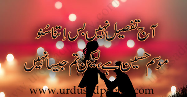 Aaj Tafseel Nahi Bus Itna Suno by Editorial Staff · Published July 17, 2018 · Updated November 7, 2024 Aaj tafseel nahi bus itna suno Mousam haseen hai lakin tum jesa nahi Share