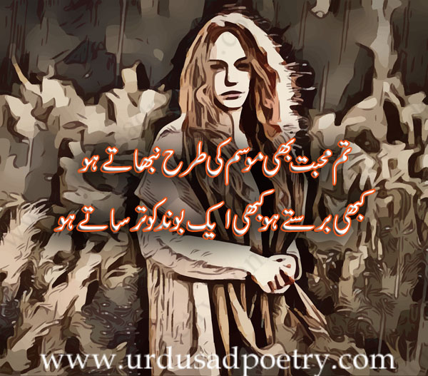 Tum Mohabbat Bhi Mousam Ki Tarha Nibhate Ho by Editorial Staff · Published July 28, 2018 · Updated November 7, 2024 Tum mohabbat bhi mousam ki tarha nibhate ho Kabhi baraste ho kabhi ek boond ko tarsate ho Share