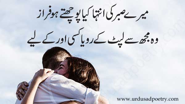 Meray Sabar Ki Intiha Kiya Pochte Ho Faraz by Editorial Staff · Published January 14, 2019 · Updated November 7, 2024 Meray sabar ki intiha kiya pochte ho Faraz Woh mujh se lipat ker roya kisi aur ke liye Share