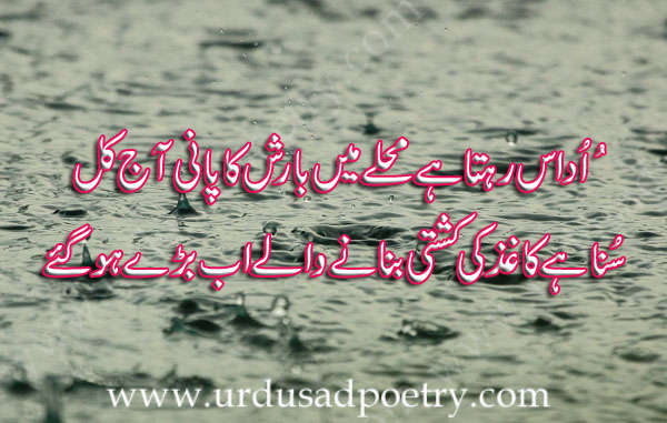 Udas rehta hai muhlley main barish ka pani aaj kul Suna hai kaghaz ki kashti bnane waly ab barey ho...
