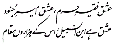 Ishq Fakeer-e-Haram, Ishq Ameer-e-Junood, Ishq hai Ibn-e-Sabeel, Is ke Hazaroon Muqaam…